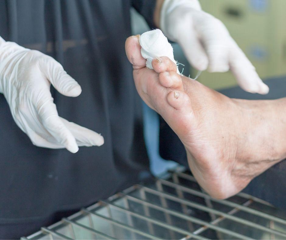 - Diabetes can lead to neuropathy, a loss of sensation in the feet. When feeling diminishes, it becomes more challenging to notice the discomfort typically associated with small nicks and cuts or other injuries. Peripheral arterial disease, a reduction in blood flow to the feet, is a common complication of diabetes. Without enough blood, it can be hard for small injuries to heal. Infection can set in and diabetic ulcers, bone-deep wounds can occur, leading to hospitalization and amputation. Be alert to any changes in the feeling or appearance of your feet and report any new symptoms to your podiatrist without delay. If it’s hard for you to see your own feet, ask a loved one to help.